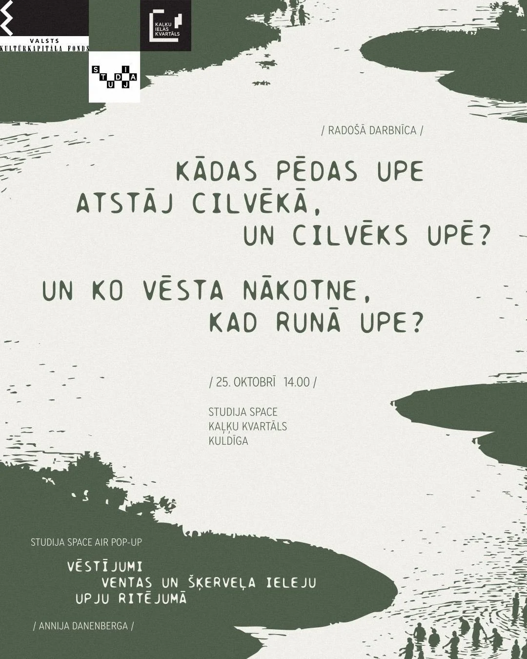 Pievienojies 25.oktobrī uz radoši–pētniecisku darbnīcu: ‘Kādas pēdas upe atstāj cilvēkā, un cilvēks upē? Un ko vēsta nākotne, kad runā upe?’, kuru moderēs tās veidotāja Annija Danenberga.
